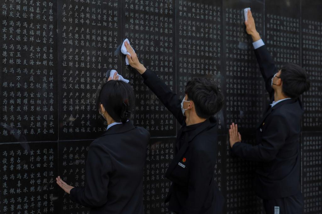 党员同志和入党积极分子代表逐一向革命烈士敬献花束,依次缓步绕纪念碑一周,深情瞻仰革命烈士纪念碑并向革命先烈默哀一分钟以告慰英雄的忠魂,表达对烈士们的敬仰之情。学生代表怀着崇敬的心情擦拭着英烈们的碑文,一个个英烈的名字,彰显着中华民族永垂不朽的革命精神!
