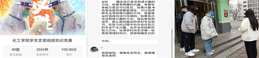 学生党员作表率,志愿帮扶暖人心。每名学生党员负责3-4个寝室,每天到责任区宿舍走访进行查寝、谈心,了解学习生活等问题并及时反馈。学生党支部将全体学生党员分成六组志愿服务小分队,分别开展网格化巡查、查寝测温、防疫政策宣传监督提醒、清理卫生等志愿服务活动。针对同学们学习、生活、心理等方面的问题,进行线上答疑解惑,彰显了学生党员的青春力量。利用微信小程序开展“化工学院学生党支部战疫竞赛”,科普防疫知识,提高防疫意识。
