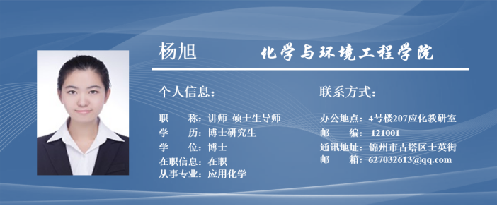 杨旭,女,1993年生,内蒙赤峰人,博士,讲师,硕士生导师。2021年11月毕业于哈尔滨工业大学化学工程与技术专业,获工学博士学位。现为WilliamHill威廉希尔内聘副教授,目前加入化工新材料开发及应用技术课题组,课题从事:(1)静电纺丝技术制备复合纤维;(2)污水中Cr(VI)吸附性能研究。以第一作者发表SCI论文5篇,申请专利一项。