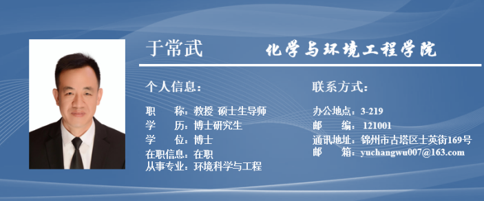 于常武,男,1975年生,内蒙古赤峰人,博士,教授,硕士生导师,辽宁省普通高等学校本科教学名师、锦州高校名师,先后指导研究生8名。2010年9月毕业于大连理工大学水文学及水资源专业,获工学博士学位。现任william威廉中文教务处处长、创新创业教育中心主任,负责全校教育教学和创新创业教育工作。 长期从事环境科学与工程专业教学与科研工作。近年来,重点围绕工业废水处理的高级氧化、光催化氧化、吸附、反渗透、絮凝净化、大气污染防治及工业废渣资源化等方面开展技术研发、工艺设计与工程应用工作,在工业废水处理、大气污染物迁移转化规律及数值模拟、土壤污染调查与评价、区域环境重金属污染环境地球化学评价、畜禽污染防治规划、生态城市建设规划以及工程概预算等方面开展了大量研究与应用工作,主持或参加横纵向项目10余项,发表SCI、EI、CSCD及中文核心等学术论文30余篇。主讲课程《水污染控制工程》建成辽宁省一流本科课程,教育教学研究成果获辽宁省教学成果一等奖3项,william威廉中文校级教学成果一等奖2项。 Ø 教育及工作经历 2004/9 - 2010/9,大连理工大学,水文学及水资源,博士,导师:许士国 1999/9-2002/5,辽宁工程技术大学,矿产普查与勘探,硕士,导师:王宇林 1994/9-1998/7,辽宁工程技术大学,水文地质与工程地质,本科,班主任:王宇林 1998.07--1999.08 内蒙古煤田地质局151勘探公司 助理工程师 2002.06--2008.09 william威廉中文讲师 期间任环境教研室主任 2008.10--2019.11 william威廉中文副教授 期间任环境教研室主任、校教务处副处长 2019.12--2020.05 william威廉中文教授 期间任校教务处副处长 2020.06-- william威廉中文创新创业教育中心主任,教授 Ø 研究方向 Ø 1. 大气污染机制及治理技术 2.工业废水处理技术研发与工程应用 3. 区域生态环境评价与修复技术开发 4. 污染物迁移转化规律数值模拟 Ø 科研课题 1. 安徽界沟矿业有限公司界沟煤矿地温研究,安徽省煤田地质局第三勘探队,2024.09,主持 2. 营口市空气质量保障第三方技术支持服务项目,营口市生态环境局,2022,主持(参加) 3. 光催化降解高浓度喷漆废水关键技术研发,辽宁省重点科技计划项目,2017,主持 4. 汽车零部件全自动喷漆线废水处理技术,辽宁省高等学校产业技术研究院项目,2018,主持 5. 藻类吸附重金属钼的机理及在钼矿区污染治理中的应用,辽宁省教育厅一般项目,2013,主持 6. 工业有机废水非均相催化氧化治理技术开发与应用,辽宁省教育厅服务地方项目,2019,主持 7. 露天矿大高差溜槽运输粉尘析出机理与逸散规律研究,自然科学基金委,2017(参加) 8. 腐殖质类化学吸附层防治钼尾矿钼污染的技术研究,william威廉中文,2012,主持 9. 全自动喷漆线废水处理及中水回用工艺化开发,横向项目,2017,主持 10. 辽宁靖帆新材料有限公司项目高效气浮机设备开发、制造,横向项目,2019,主持 11. 延吉市再生资源环境无害化处理中心项目高效气浮机设备开发、制造,横向项目,2019,主持 12. 建昌县特殊教育学校饮用水全自动除氟技术及装置化开发,横向项目,2021,主持 13. 兴城市声环境功能区划分调整项目,合同额24.0万元,企业横向项目,2022,主持 Ø 代表性科研成果(专著、论文、发明专利及获奖) [1]Yu.C, Xu. S. Molybdenum pollution and speciation in Nver River sediments impacted with Mo mining activities in western Liaoning, northeast China[J]. Int. J. Environ. Res.,2011,05(1):205-212. [2]Shiguo XU, Changwu YU,Yoshinari HIROSHIRO. Migration Behavior of Fe, Cu, Zn, and Mo in Alkaline Tailings from Lanjiagou[J].2010,70(2):19-31. [3]于常武,高超,王琳. 磺化褐煤对废水中MoO42-的吸附性能[J].辽宁工程技术大学学报,2016,35(07):770-775. [4]于常武,高超,王琳.腐殖质吸附重金属钼(MoO42-)的性能研究[J]. 环境工程,2015,33(06):10-14. [5]于常武,高超. 丝藻对含钼废水中MoO42-的吸附特性及机制研究[J].环境污染与防治,2015,37(07):55-60. [6]于常武,周立岱,陈国伟. 钼污染物的产生及在环境中的迁移[J].化工环保,2008,28(05):413-417. [7]于常武,刘春怡. Fenton法处理全自动喷漆线废水的工艺特性及动力学模型[J]. 水处理技术,2019,45(10).60-63. [8]于常武,刘春怡,周立岱,等. 磁载TiO2光催化剂处理喷漆废水的影响因素及动力学特性[J]. 环境污染与防治,2019,41(10). 110-115. [9]于常武,刘春怡,吴世国. 改性褐煤对喷漆废水中有机物的吸附[J]. 环境工程,2019,45(09). 1137-1411. [10]刘春怡,于常武. 可回收型光催化剂的制备技术及应用进展[J]. 水处理技术,2019,45(10).6-10. [11]郭星,孙婷,于常武,等. 磁性TiO2rGO-Fe3O4复合光催化剂的制备及性能研究[J]. 应用化工,2018,47(10).2135-2139. [12]郭星,于常武,李柏志,等.磁性TiO2光催化机制及在污水处理中的应用研究[J]. 应用化工,2018,47(7).1518-1522. [13]于常武,许士国,陈国伟,等. 酸碱度温度对钼尾矿中Mo静态浸出的影响[J]. 环境科学与技术,2018,31(07):1-3(20). [14]于常武,许士国,陈国伟,周立岱. 矽卡岩型钼矿尾砂中重金属Mo的淋滤实验研究[J]. 生态环境,2008, 17(2): 636-640. [15]于常武,许士国. 水资源科学发展观哲学浅析[J]. 华北水利水电学院学报(社会科学版),2005,21(03):105-107. [16]佟绍成,于常武,吕义,等. 《构建“四融合”创新实践育人模式 提升大学生实践创新能力》. 辽宁省教学成果一等奖,辽教函[2018]159号. [17]刘伟东,于常武,王冬霞,等. 《信息化技术与本科教学“四融合”体系的构建与实践》.辽宁省教学成果一等奖.辽教发[2020]42号.
