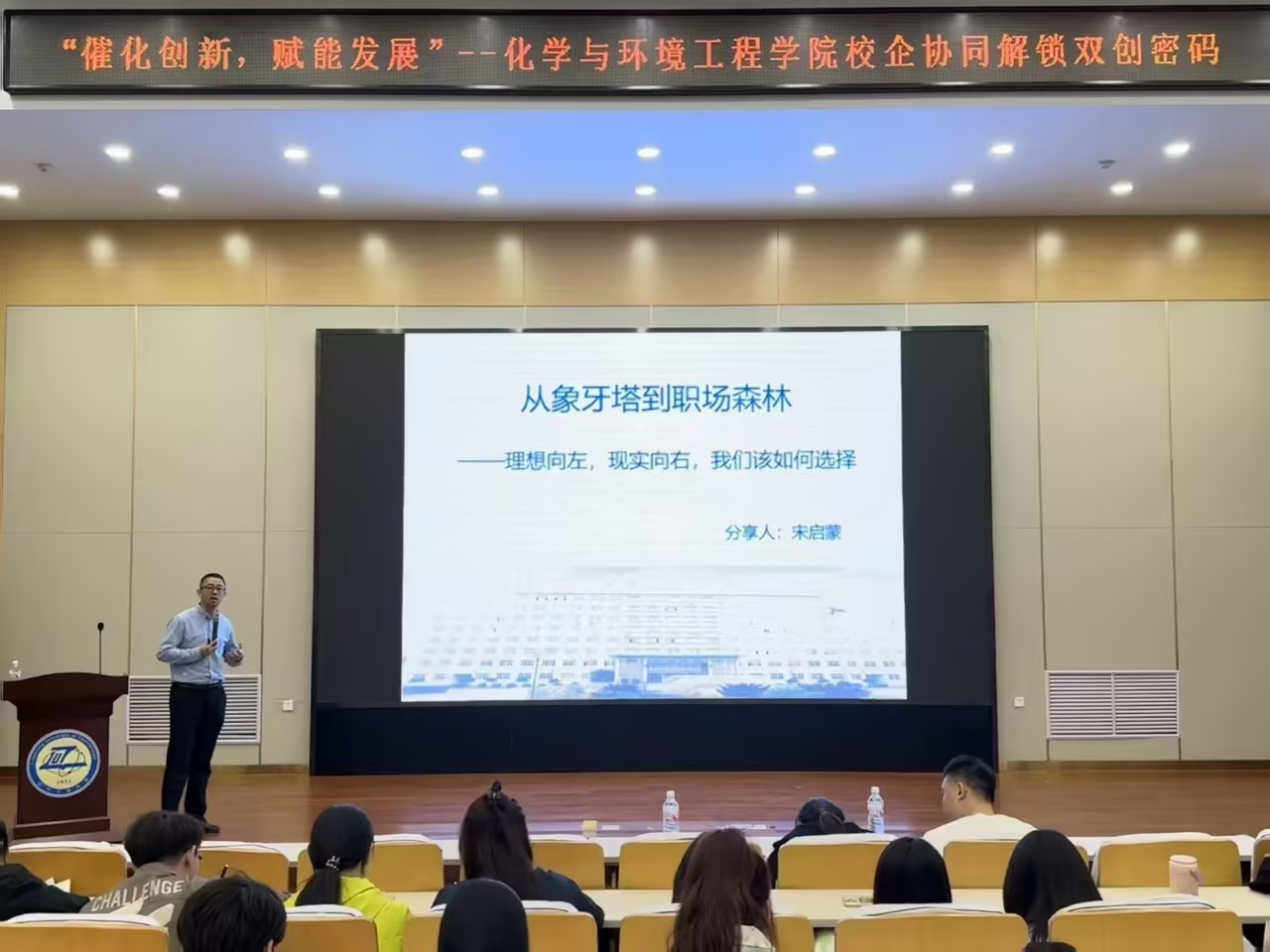 主题分享环节,宋启蒙利用生动的案例和详实的数据,深入剖析了学生在理想与现实之间的不匹配与错位,以及如何逆袭的具体方案与措施,同时结合自己多年的职场经验,分享了企业的需求和职场的生存法则。他以自身的经历鼓励同学们要勇于面对挑战,积极寻求机会,不断提升自己的综合素质和能力,努力做出一系列的转变,包括思维方式的转变、职业技能的提升以及人际关系的处理等。