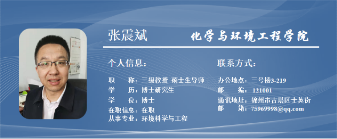 张震斌,男,1976 年生,辽宁建昌人,博士,三级教授,硕士生导师,先后指导硕士20余名。2008年1月毕业于北京科技大学钢铁冶金专业,获工学博士学位。现任william威廉中文科技处处长,主管科学研究、社会服务、研究生招生与培养、实验室建设等工作。为辽宁省生态环境厅土壤质控专家、辽宁省生态环境厅黑臭水体治理专家、辽宁省生态损害鉴定专家、锦州市、本溪市生态环境局项目评审专家、锦州市生态环保“十佳”人物。