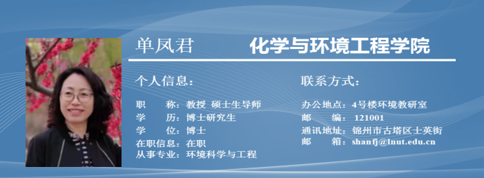 Ø 代表性科研成果(专著、论文、发明专利及获奖) [1] Aijia Zhang , Fengjun Shan , Zhenbin Zhang. Efficient decontamination of tetracycline via fenton-like process mediated by chitosan-based Fe-MOFs under wide pH range[J].Separation and Purification Technology,2024,344:127212. [2]Yuxin Wang , Yueqi Chen , Fengjun Shan , Tingting Zhang. L-glutamic acid-functionalized graphene oxide with characteristic of anti-stacking towards efficient adsorption-reduction removal of Cr(VI)[J].Journal of Environmental Chemical Engineering,2024,12:114764. Ø 研究生招生 招收对环境科学与工程具有浓厚兴趣,拥有较强实验能力和良好科学研究素养,具有环境科学、环境工程、生态工程、化学工程与工业、应用化学等专业背景的具有学士学位的学生。